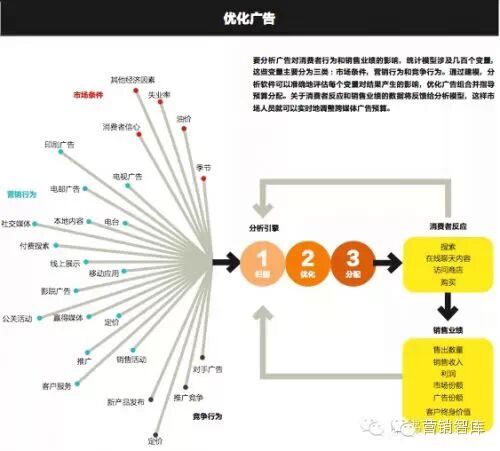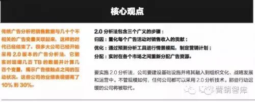 由于整合了大数据分析、云计算和新型分析模型,2.0分析法在广告市场回报方面为公司提供了全新的视角。2.0分析法包含三个广义的步骤:归因,即量化广告活动各环节对销量的贡献;优化(或模拟演习),即在先进的预测分析工具帮助下进行情景模拟;分配,即根据优化结果,实时配置各类营销活动的资源。尽管这三个步骤在本文中有先后循序,但在实操中,这三个步骤有可能同时进行。